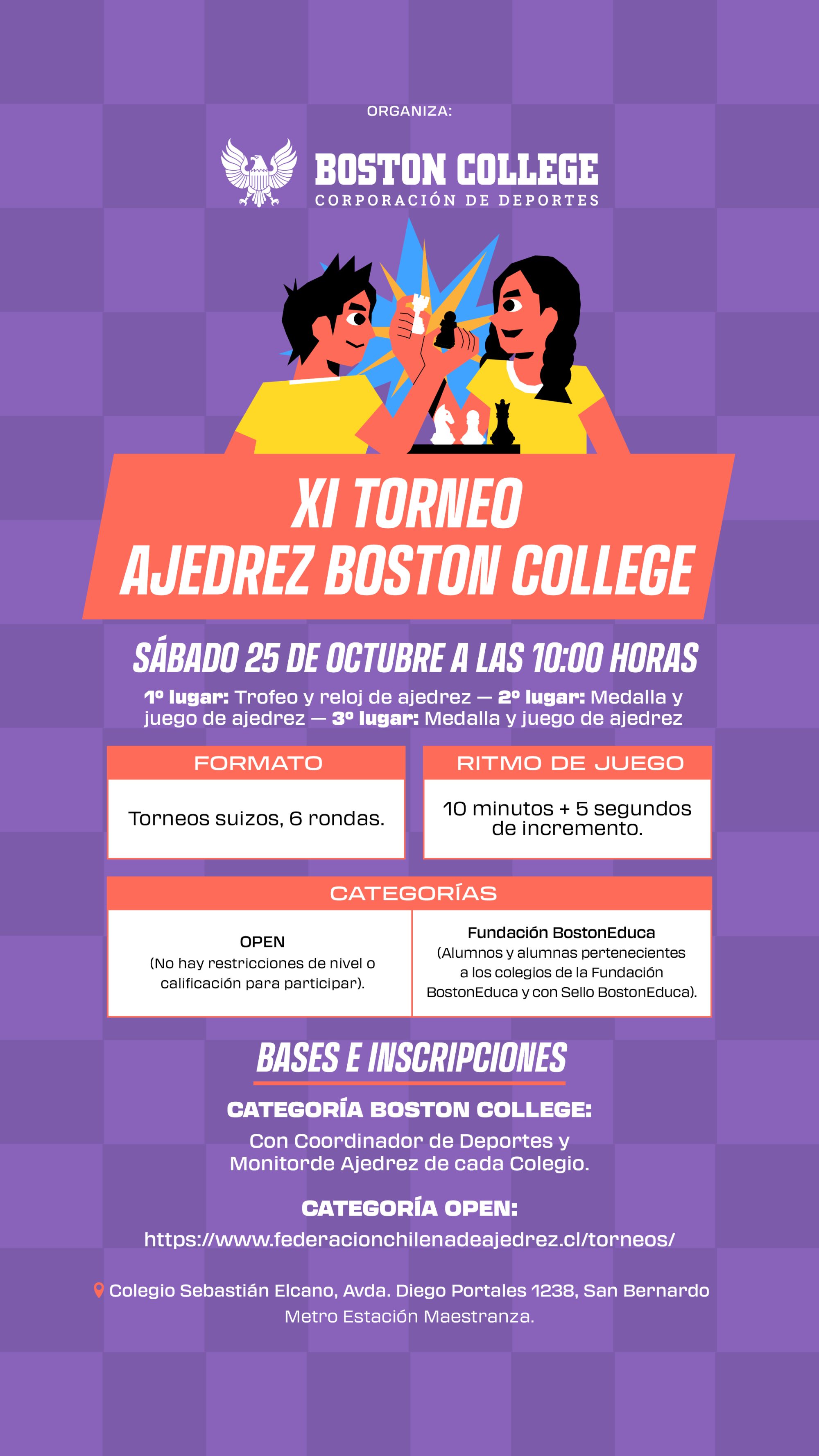 La Corporación de Deportes Boston College invita a todos los estudiantes y ajedrecistas a ser parte de la XI Versión del Torneo de Ajedrez, que se llevará a cabo el sábado 25 de octubre a las 10:00 horas en el Colegio Sebastián Elcano (Av. Diego Portales 1238, San Bernardo / Metrotren Estación Maestranza).